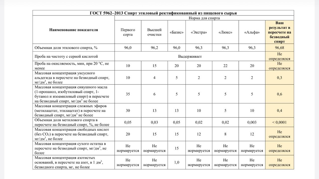 Газохроматографический анализа, позволяет определить содержание различных компонентов в спиртосодержащем образце. Если проще, то его чистоту от вредных примесей. В таблице приведены данные нашего спирта.
